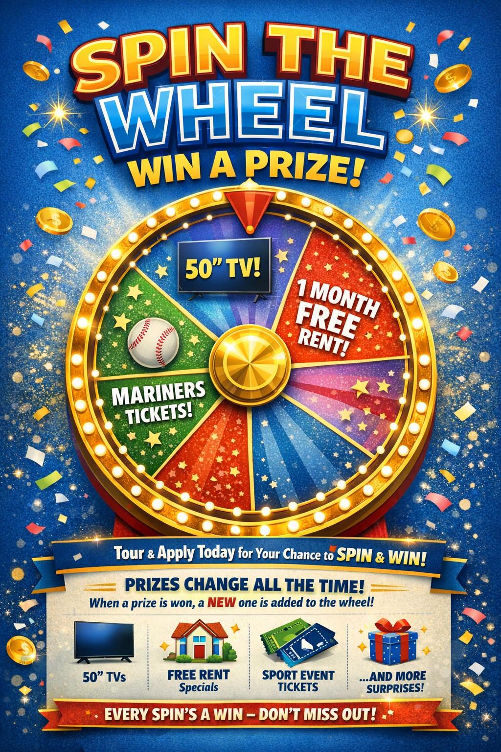 Tour and apply today for a chance to spin the wheel and score amazing prizes! 🌟 Prizes Change All the Time! When an item is won, a brand‑new prize is added to the wheel — so there’s always something exciting to win! 🎁 Possible Prizes Include: 📺 50" TVs 🌲Free night at Great Wolf Lodge 🏠 Free Rent Specials ⚾ Sport Event Tickets — including chances to win Mariners Opening Day tickets 🎟️ …and tons of other rotating surprises! Every spin is a win — and the prizes just keep getting better. Ready to take your shot? 🎡✨